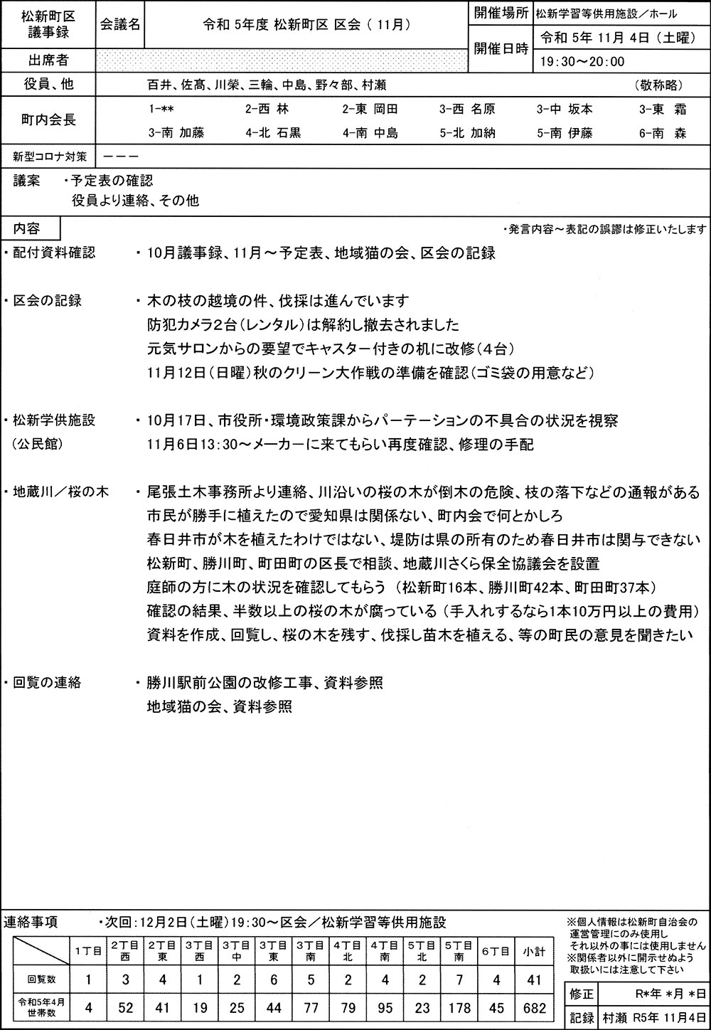松新町区・11月区会議事録/令和5年11月4日(土)